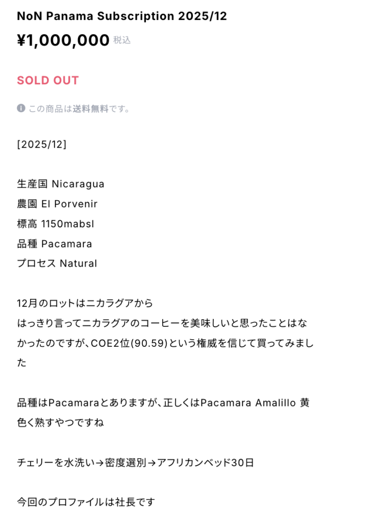 Non-Panama Monthly Subscriptionは、28g(1,500円)、56g(2,500円)から選択できます。