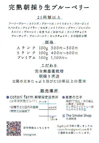 ハトコーヒーでは、札幌市南区真駒内にあるcotori farmのブルーベリーを使ったタルトを提供しています。cotori farmは農家の息子の提携農園で、25品種以上のブルーベリーが栽培されています。
