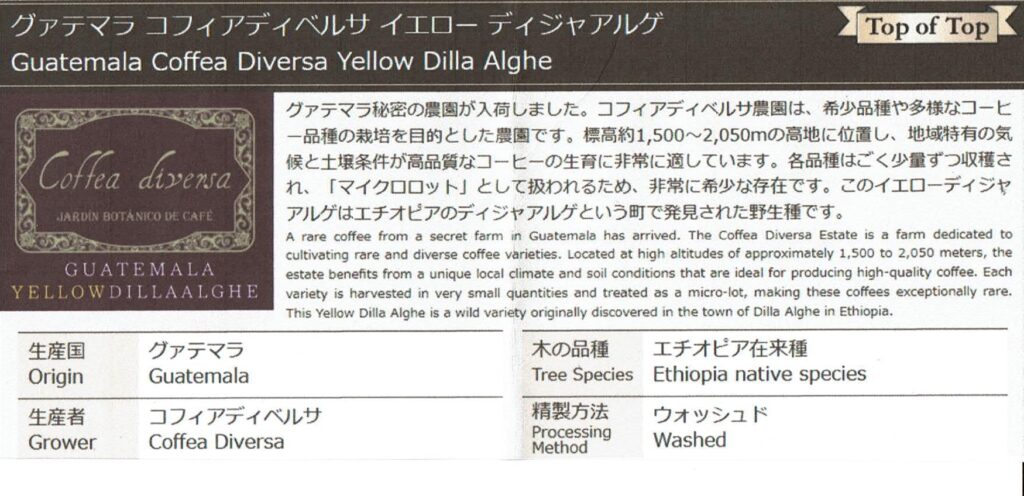 グァテマラ秘密の農園が入荷しました。コフィアディベルサ農園は、希少品種や多様なコーヒー品種の栽培を目的とした農園です。標高約1,500〜2,050mの高地に位置し、地域特有の気候と土壌条件が高品質なコーヒーの生育に非常に適しています。各品種はごく少量ずつ収穫され、「マイクロロット」として扱われるため、非常に希少な存在です。このイエローディジャアルゲはエチオピアのディジャアルゲという町で発見された野生種です。
