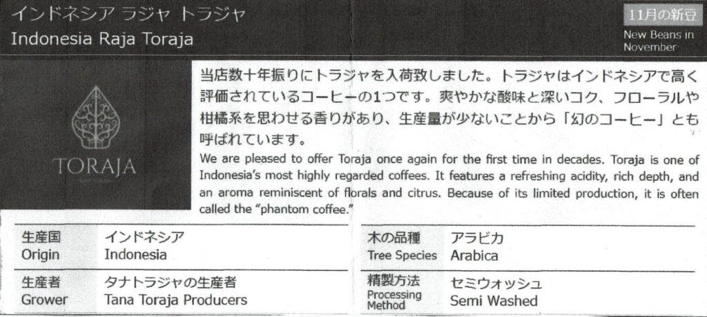 当店数十年振りにトラジャを入荷致しました。 トラジャはインドネシアで高く評価されているコーヒーの1つです。 爽やかな酸味と深いコク、フローラルや柑橘系を思わせる香りがあり、生産量が少ないことから「幻のコーヒー」とも呼ばれています。