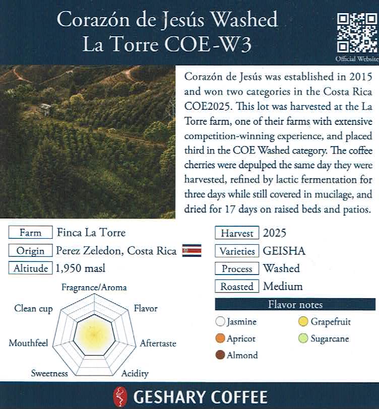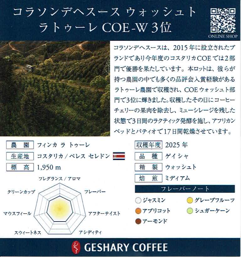 ゲシャリーコーヒー コスタリカ コラソン・デ・ヘスース ゲイシャ ウォッシュト ラ・トゥーレ コスタリカ カップ・オブ・エクセレンス 2024年 第3位です。