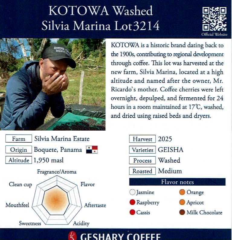 ゲシャリーコーヒー:パナマ コトワ ウォッシュト シルビアマリーナ Lot3214