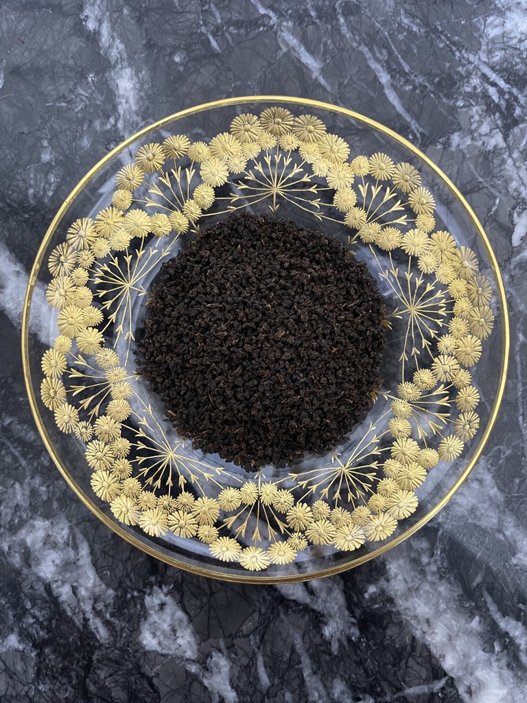 非常に細かい黒褐色の茶葉で、濃い赤褐色に抽出されます。濃厚でコクのある味わいです。