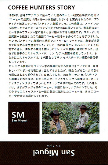 サン・ミゲル・コーヒーズ(San Miguel Coffees)は、サン・セバスチャン農園を経営するファジャ家(Falla Family)の別農園です。コーヒー生産地域としては、アンティグア・コーヒー(Antigua Coffee)に区分されます。