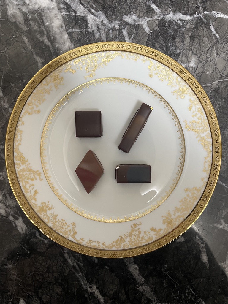 香水は独特の清涼感のあるフローラルが強くプラムと相まって紫の印象、チョコレートはプラムが強く、明るい果実感、アフターに花と茶の香りが広がります。