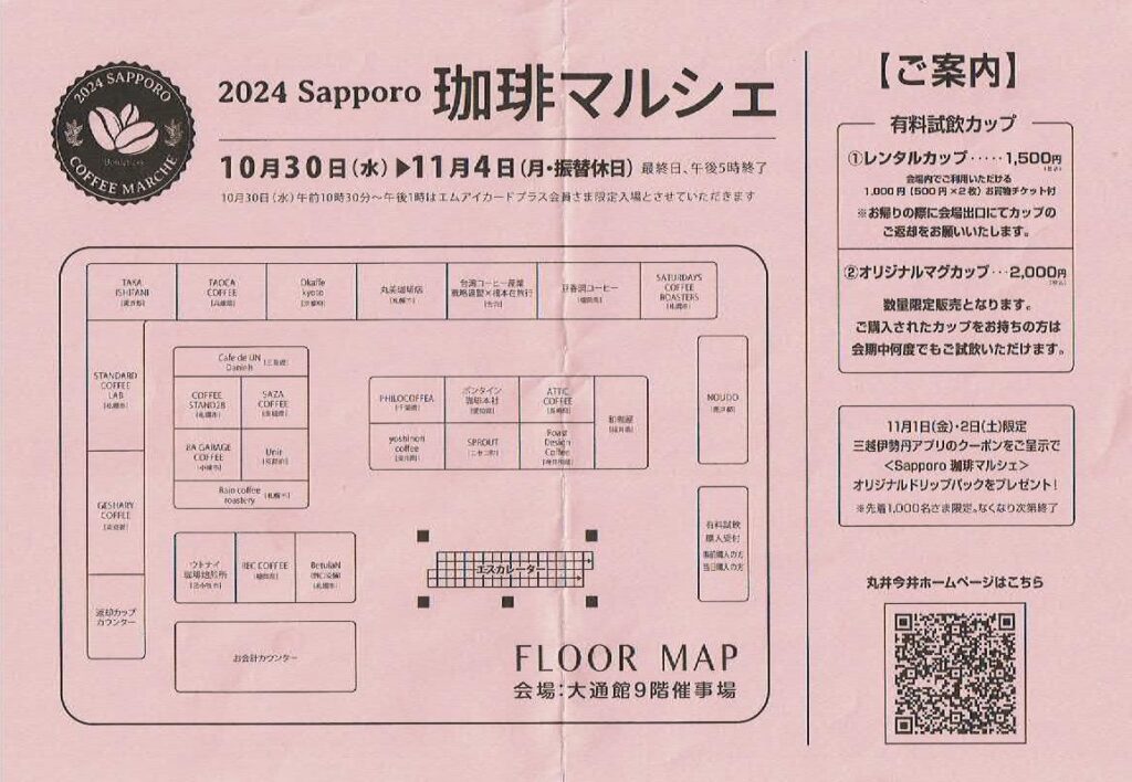Sapporo 珈琲マルシェ 2024は、2024年10月30日から11月4日まで、丸井今井札幌本店 大通館9階 催事場で開催されました。Sapporo 珈琲マルシェは、年に一度丸井今井札幌本店で開催されている珈琲のイベントです。仕掛け人は、丸美珈琲店の後藤 栄二郎(ごとう えいじろう)です。