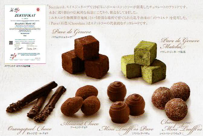 ステットラー(Stettler)は、1947年にポール・ステットラー(Paul Stettler)が創業したチョコレートメーカーです。「ジュネーブの石畳」という意味のパヴェ・ド・ジュネーブ(Pavé de Genève)は、ステットラーの代表的なチョコレートです。